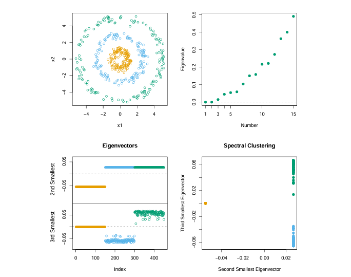 该优化问题可以通过求解稀疏矩阵的特征值问题解决。具体来说,涉及矩阵 \(\mathbf{M} = (\mathbf{I} - \mathbf{W})^T (\mathbf{I} - \mathbf{W})\) 的最小非零特征值对应的特征向量。